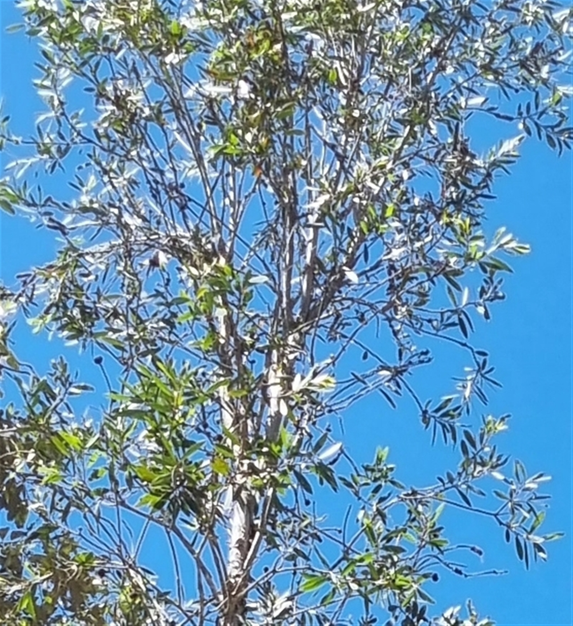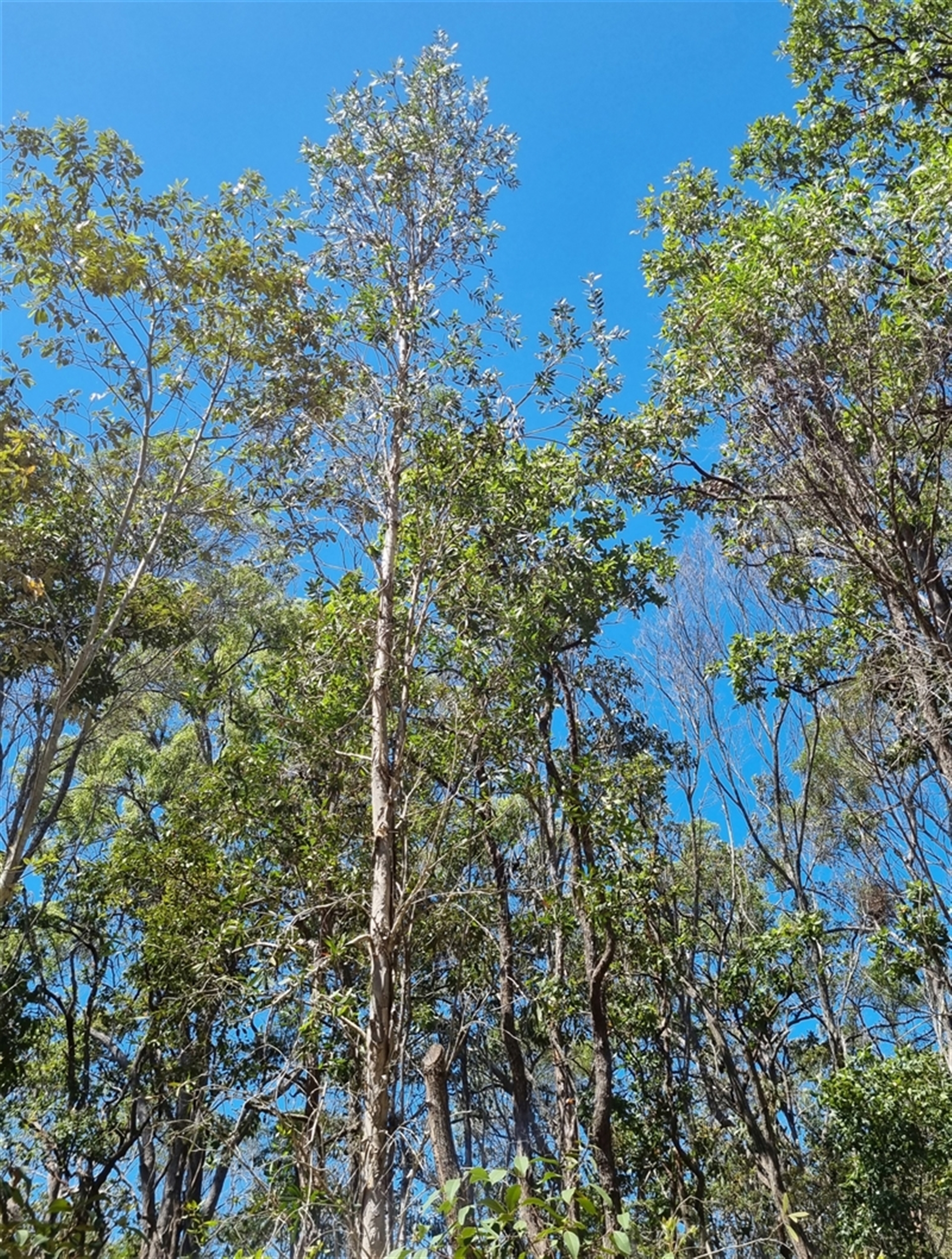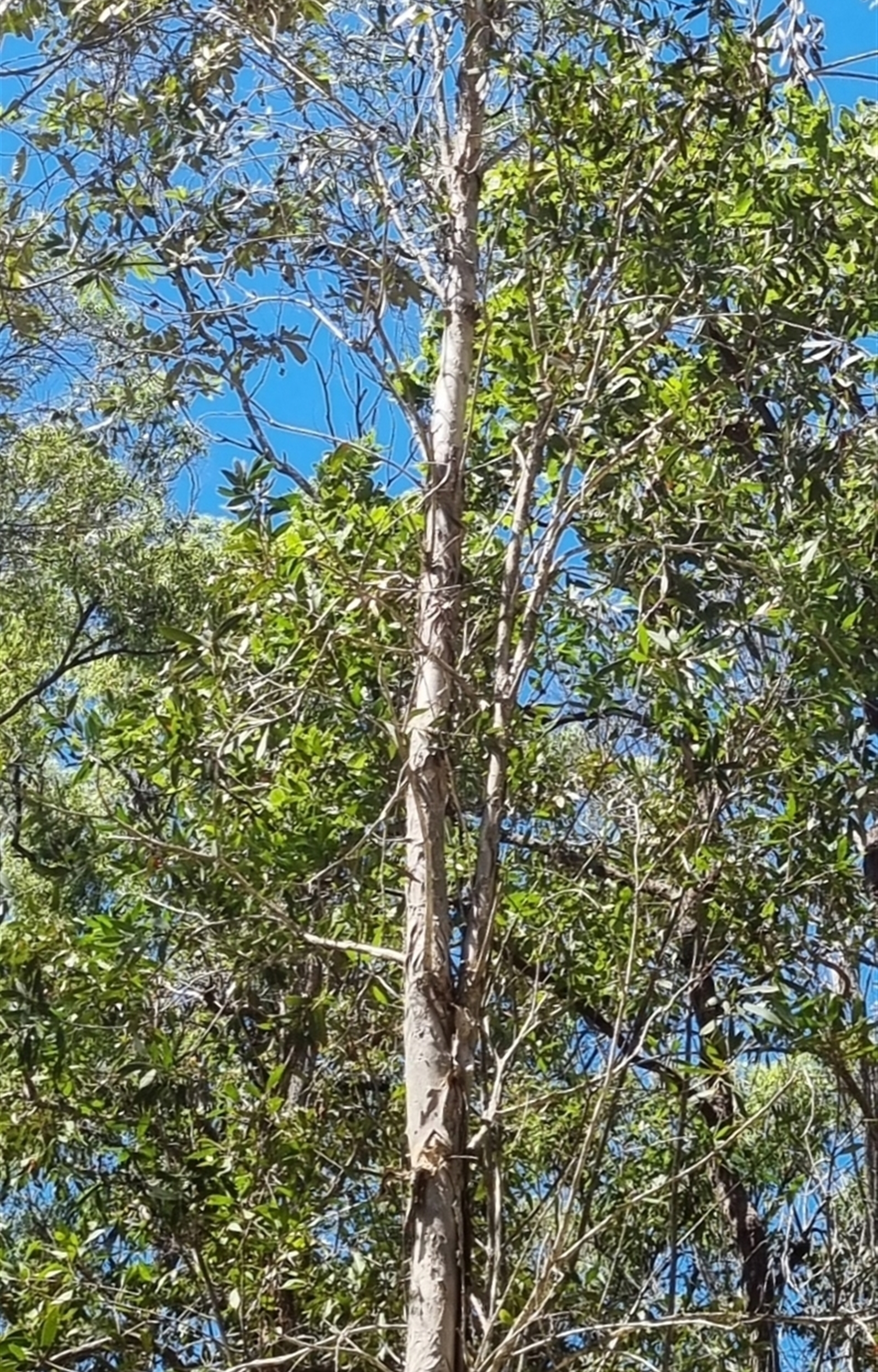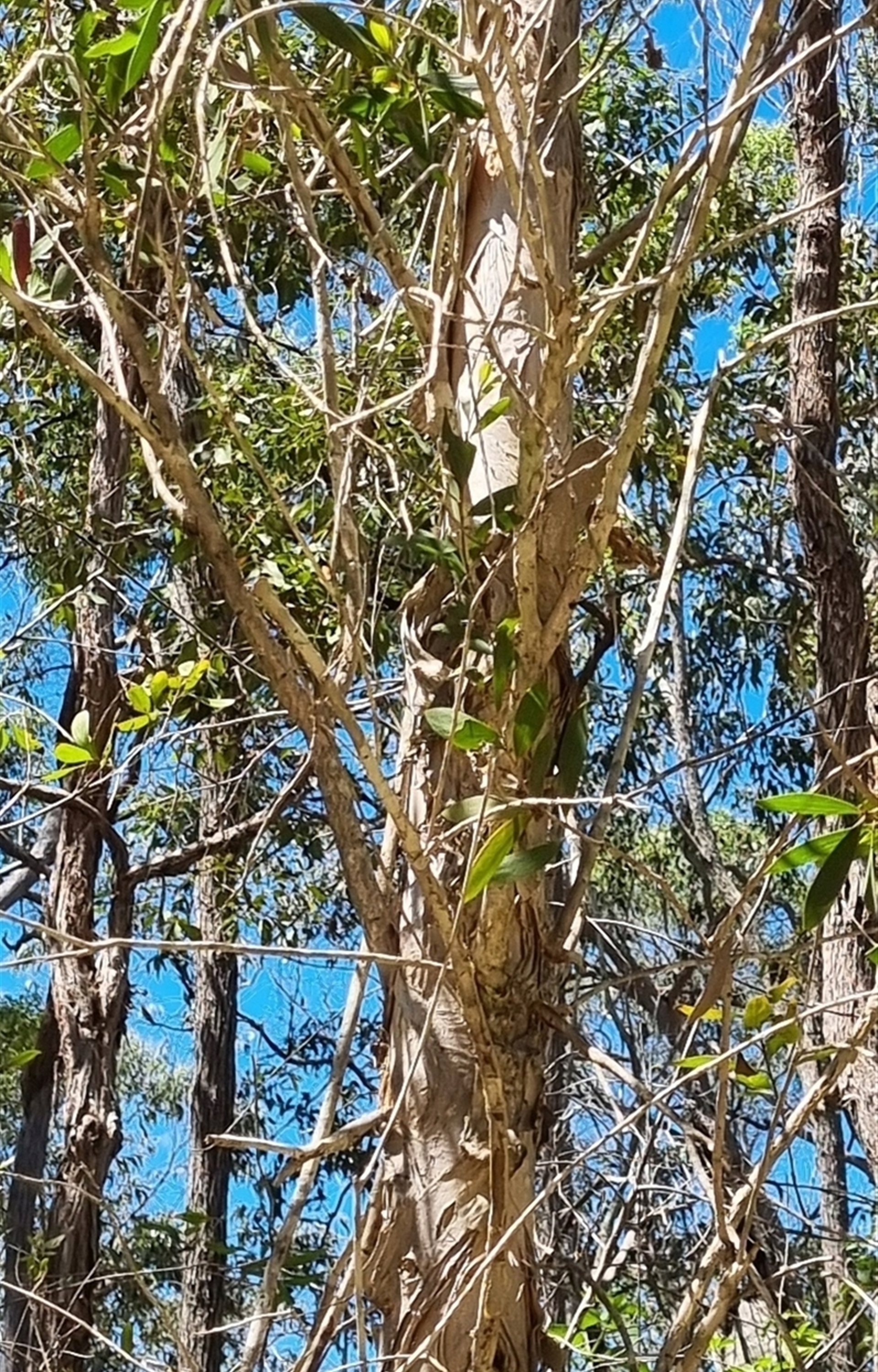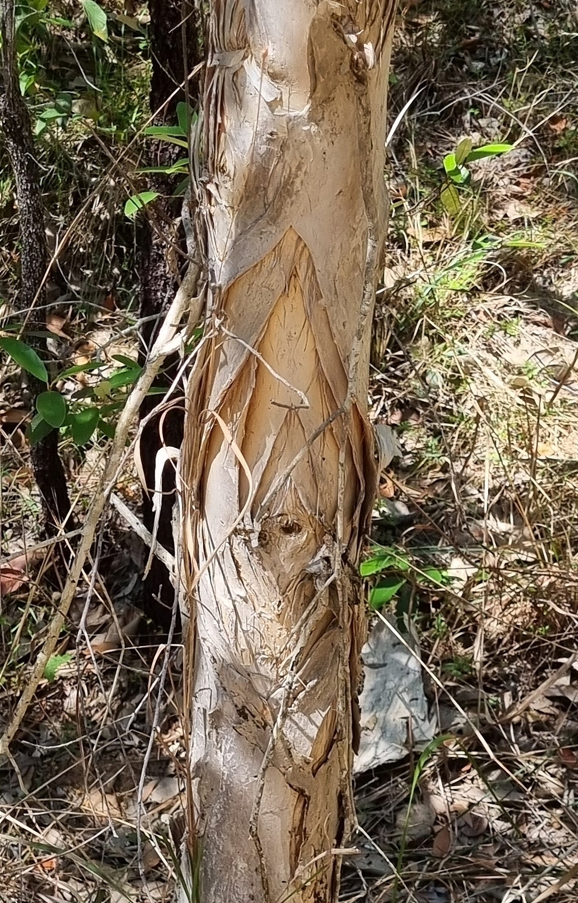 A bottle brush flowered paperbark, with cream, & at times grey, coloured bark that peels off in sheets. Pale yellow flowers. Photo 1 features the top half of the tree, photos 2 & 3 the trunk, photo 4 the leaves and photo 5 provides context.