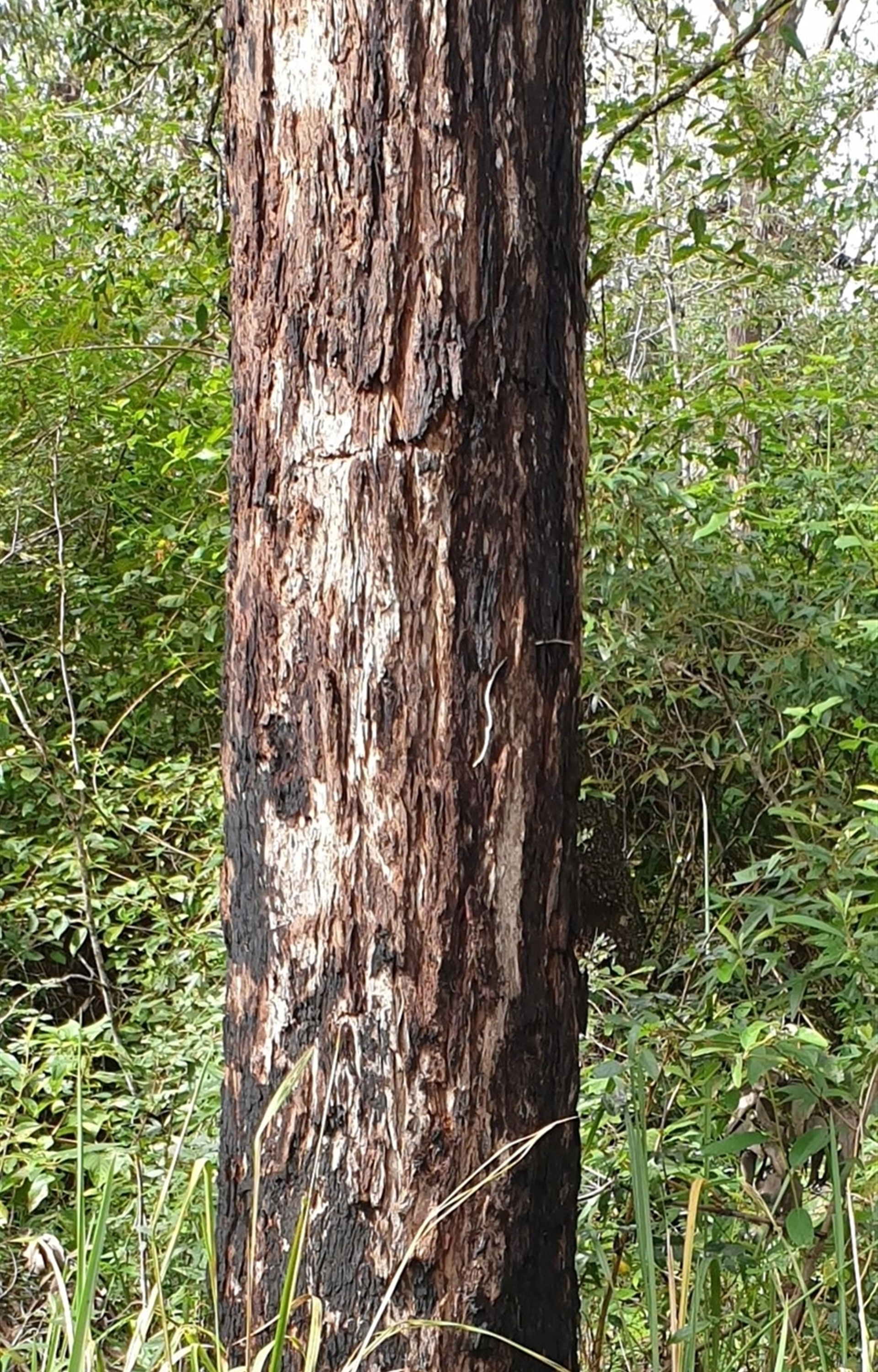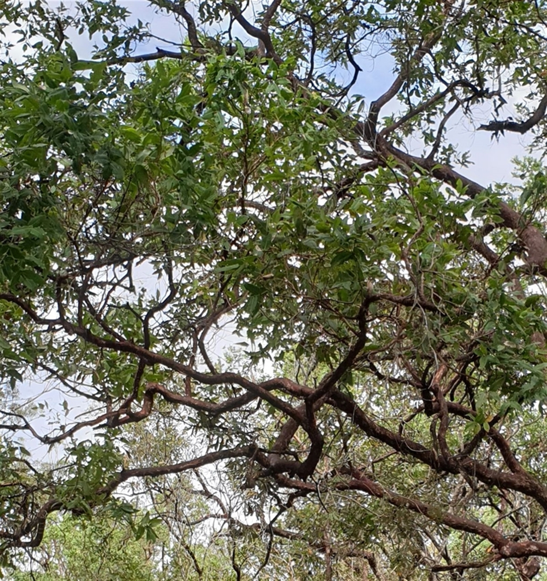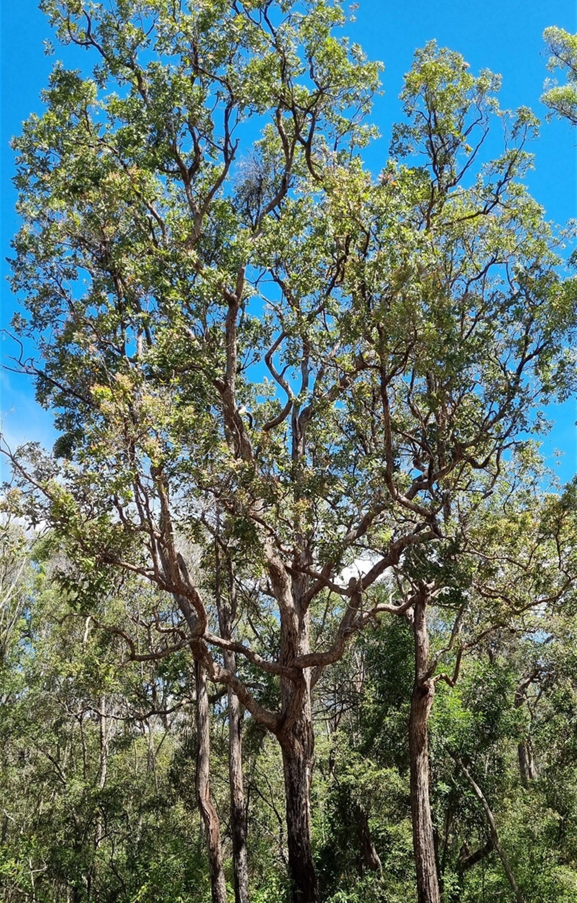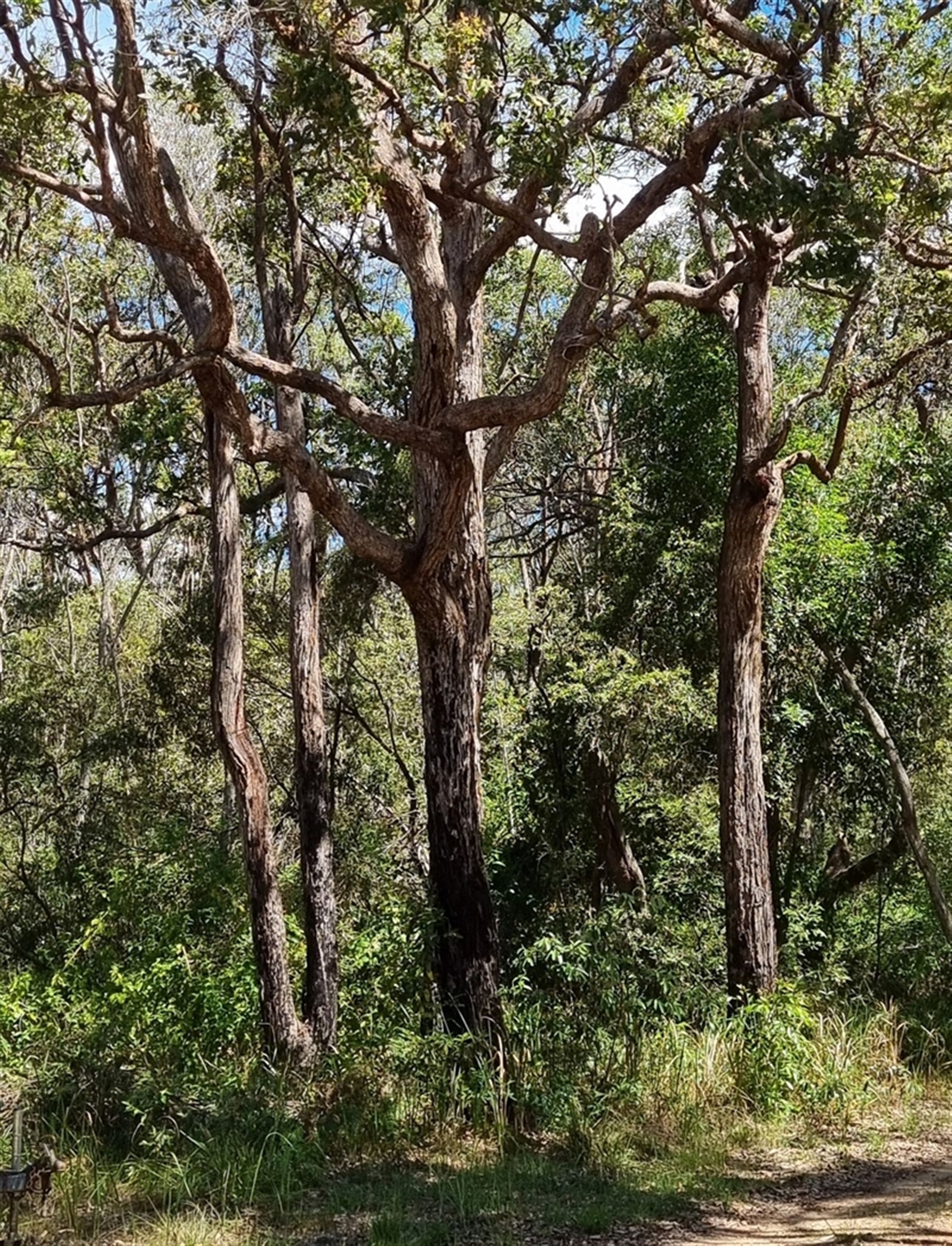 A cluster of Angophoras (which species?), in an area where there are several specimens. Photo 1 shows the cluster, and Photo 2, leaves and the distorted shapes of some the outermost branches. Photos 3 look closer at a lower trunk, and photo 4 shows some of the gnarly shapes of the larger branches. Photo 5 is a full shot of 2 of the trees from another angle.