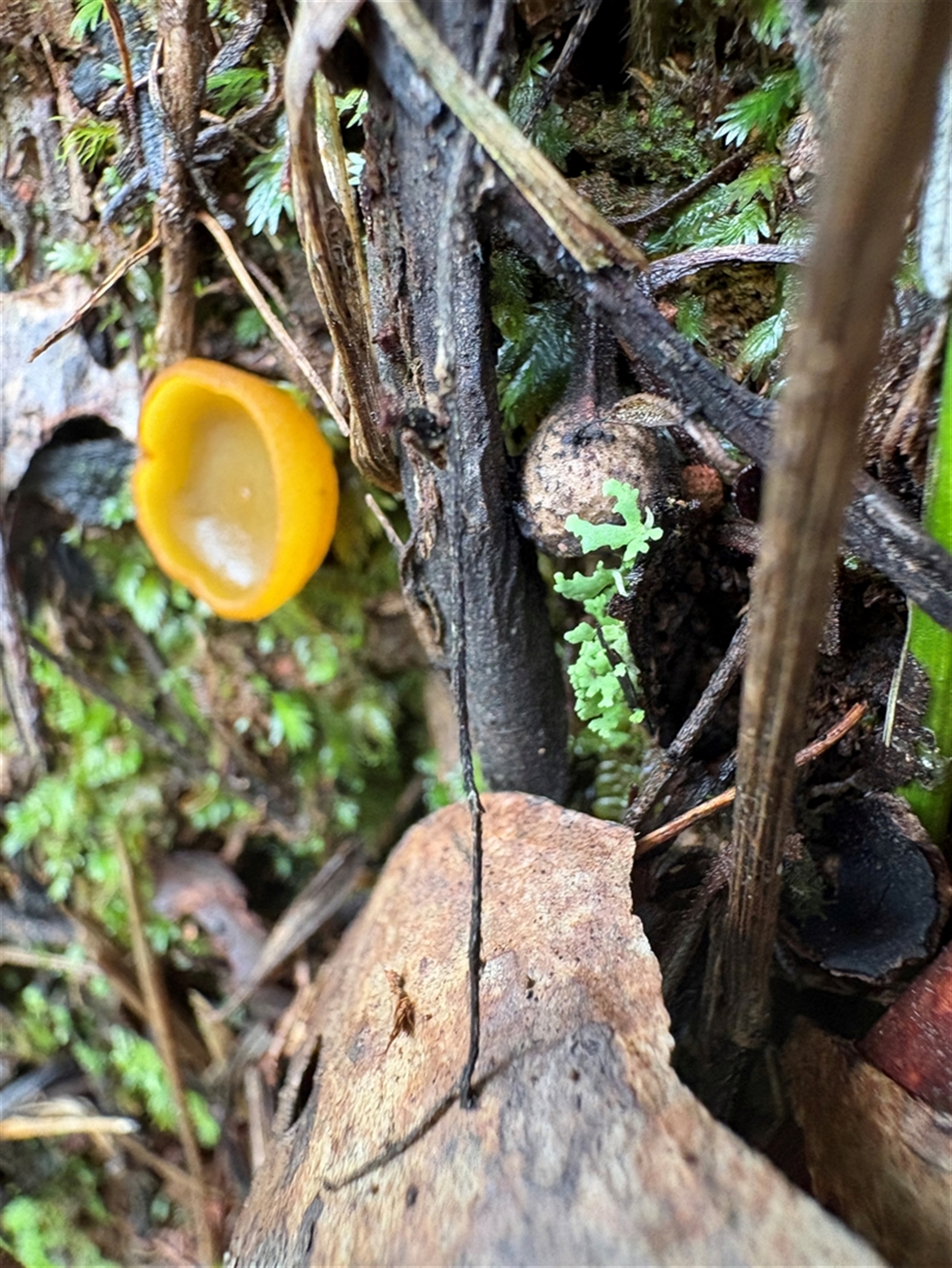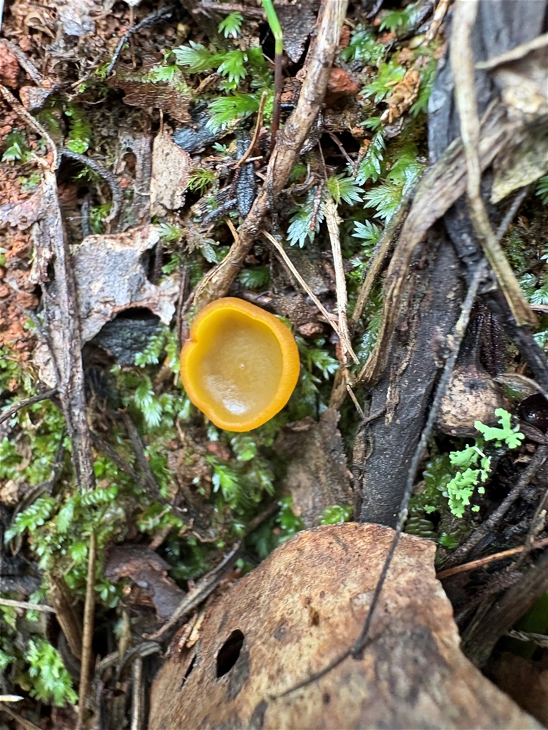 One small, orange cup-like fungi on the southern, wet side of a road cutting.
