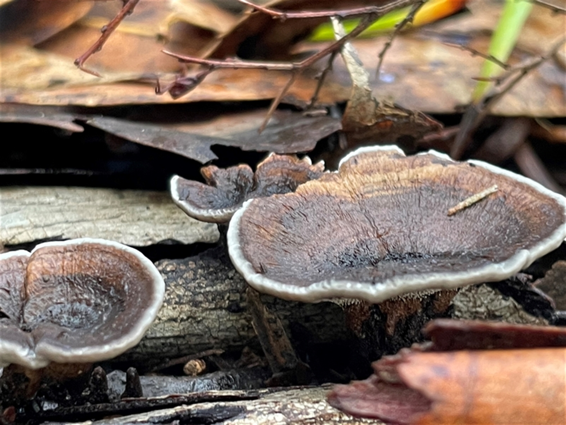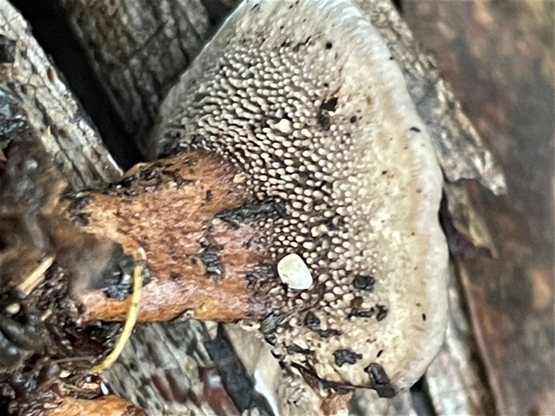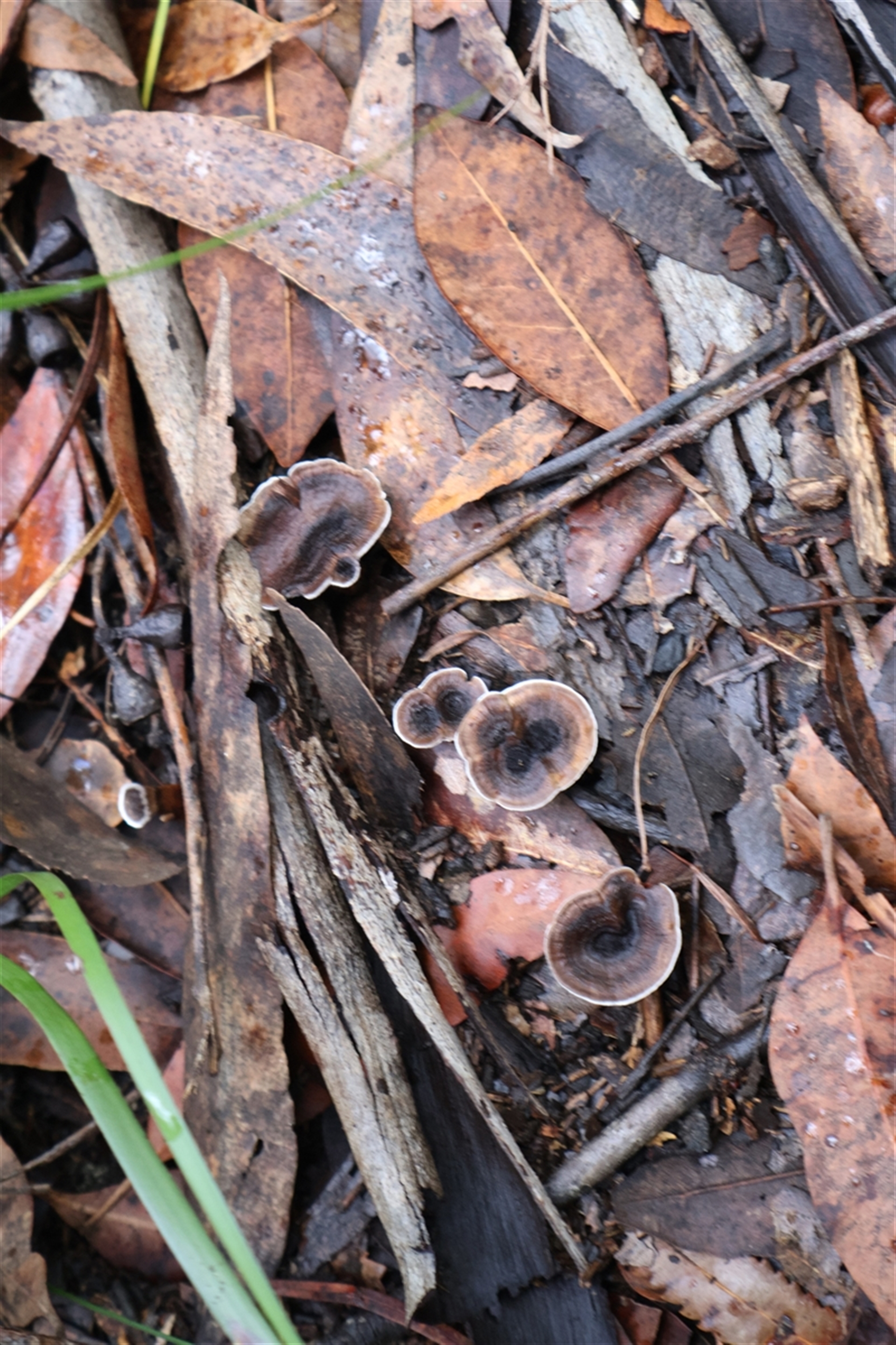 Your photos are an excellent demonstration of the need to see what's under the cap! You can see that the underside does not have pores. Instead, there are short, stubby spines. This is probably a species of Phellodon. If you look at just the upper surface you cannot be sure of even the genus.
