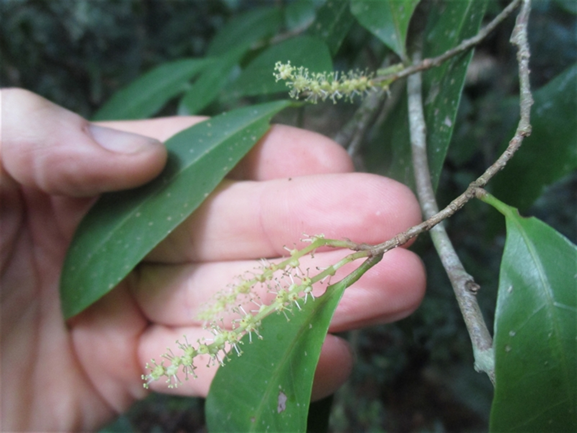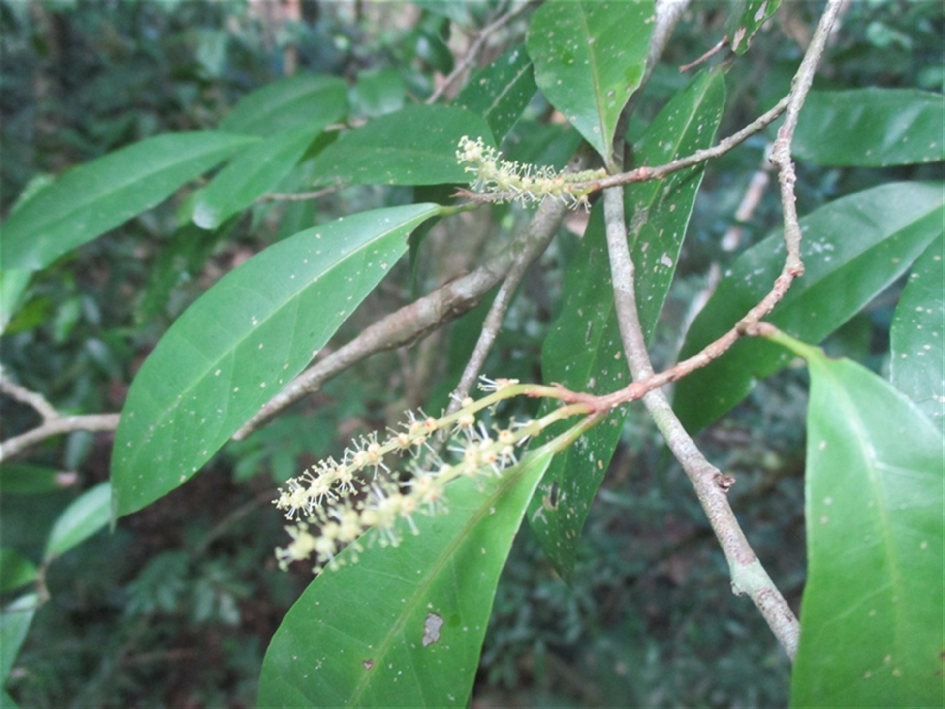 _Antidesma erostre_ Healthy tree, male flowering well spikes (inflorescences) and foliage . Mossman Gorge, main raised walkway side, before crossing over first creek . 2018 October 14th 5:11 – 5:12 pm .
