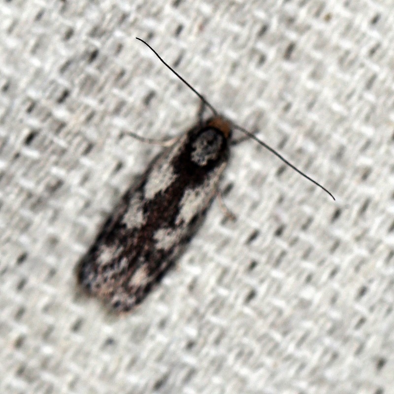 These adult moths have dark brown forewings, each with a variable broad white streak along half the wing which sometimes contains dark spots or streaks. The hindwings are brown. The wingspan is about 2 cms.