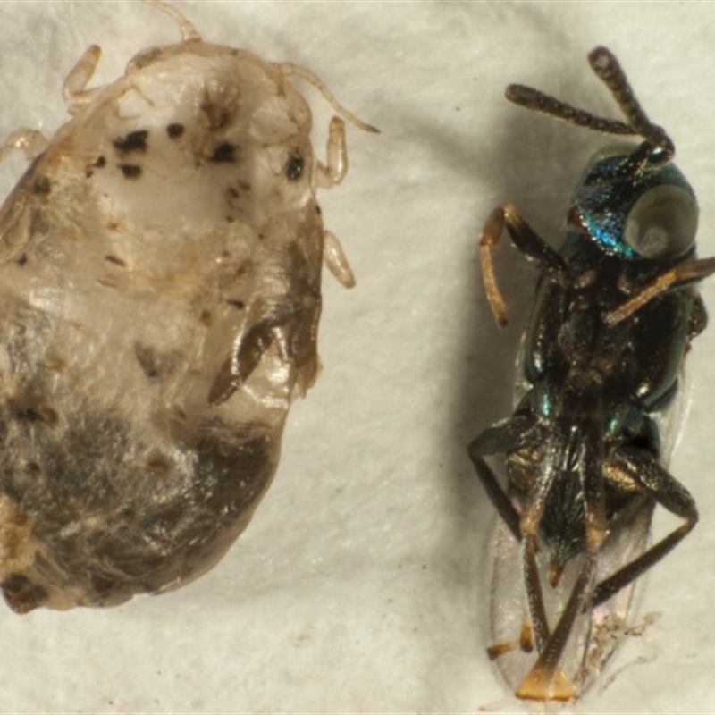 husk of the psyllid nymph on left and wasp on right