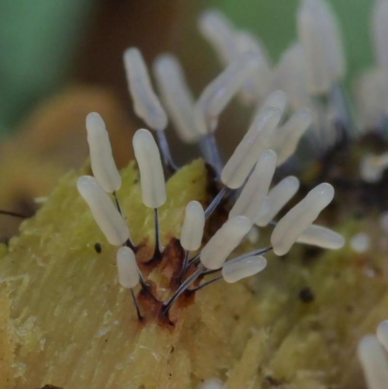 Sporangia:- scattered or in small gregarious groups, broad, cylindrical, lilaceous brown, with a silvery shiny grey peridium which flakes away with maturity.