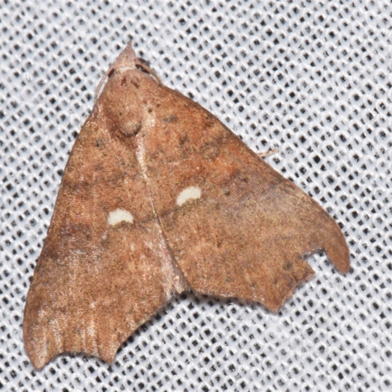 The adult moth of this species has brown forewings each with a a pattern of dark markings and a curved pale spot in the middle. Each forewing has a cusp halfway along the margin. The hindwings are pale brown with vague curvy dark bands shading into a dark area around the tornus, and a sparse arc of dark dots around the margin. The wingspan is about 3 cms. The species has been found in Queensland,and New South Wales.