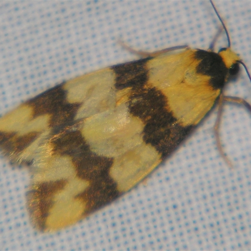 Yellow with two hollow black transverse bands, sometimes with a thin central black stripe from base to the middle of the margin.