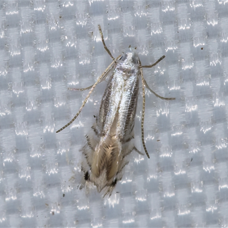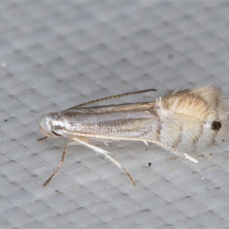 The adult moths are satin-cream, with a black dot on the tip and a gold bar across the middle of each fore wing. The hind wings are fringed by long hairs. The adults have a wingspan of about 0.5 cm. They fly nocturnally, and only live for a few days.
