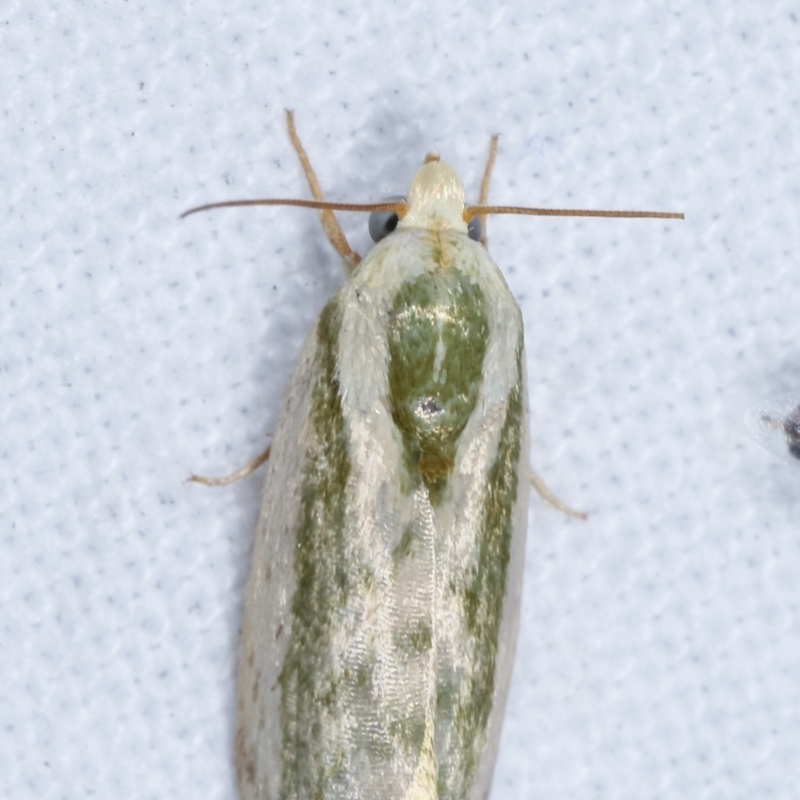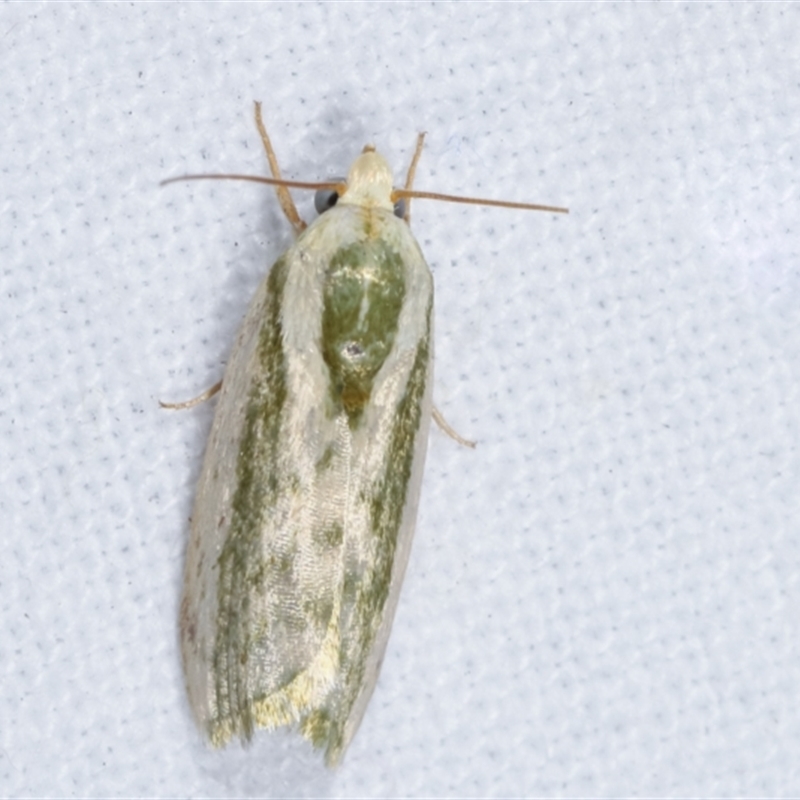 The adult moths are off-white with a green or brown stripe along the middle of each forewing, and a green thorax. The green colour is inclined to fade to brown in older specimens. The wingspan is about 1.5 cms. This species is found across south-east Asia, and Western Australia, Northern Territory, Queensland, New South Wales, and Victoria.