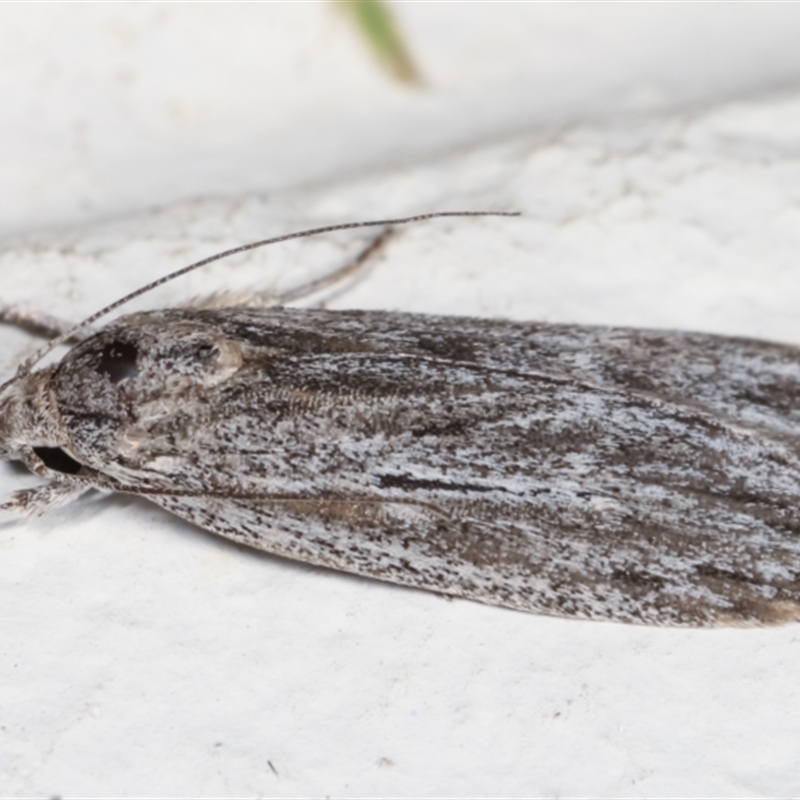 Streaky grey, wingspan is about 3 cms., flat tent-like habit. This species may be the same as Phloeograptis macrynta.